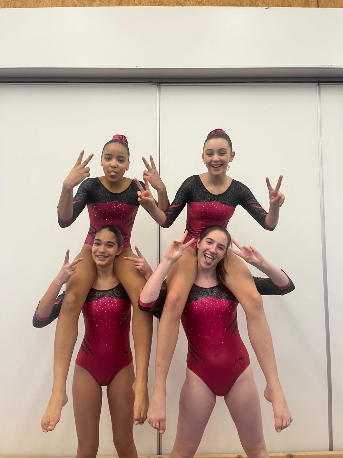 Equipe 2 10/13 ans avec Candice, Anna, Louisa, Lily, Lilou : 3ème Le mot du coach Florian : « Des mouvements qui commencent à être mieux maîtrisés notamment au sol. Des nouveautés en poutre, un super mental. Bravo aux filles, nous allons continuer de renforcer les notes de départ pour se classer plus haut à la région et pourquoi pas participer au Trophée fédéral. »