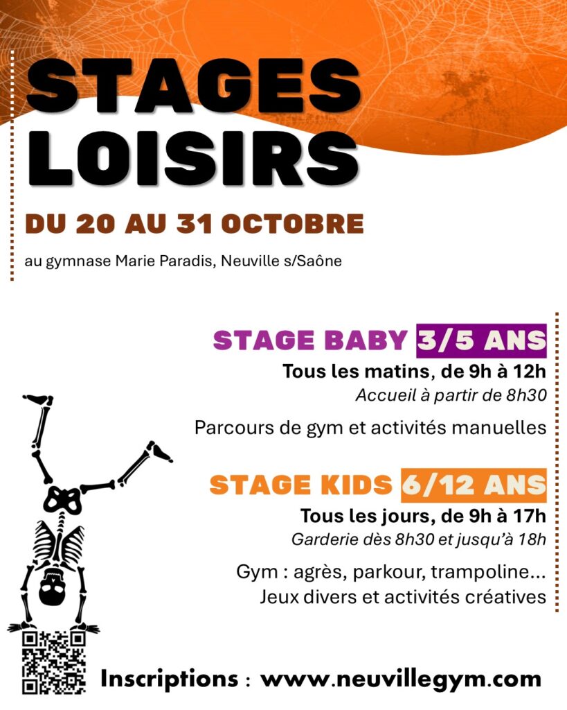 Neuville Gym propose deux stages ouverts à tous pendant les vacances scolaires de Toussaint, du 20 au 31 octobre 2025 :
