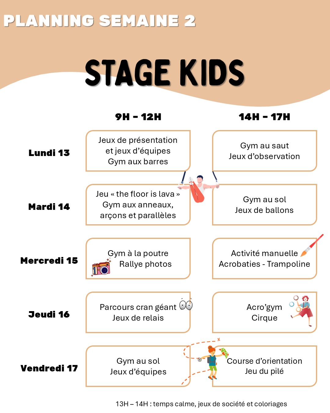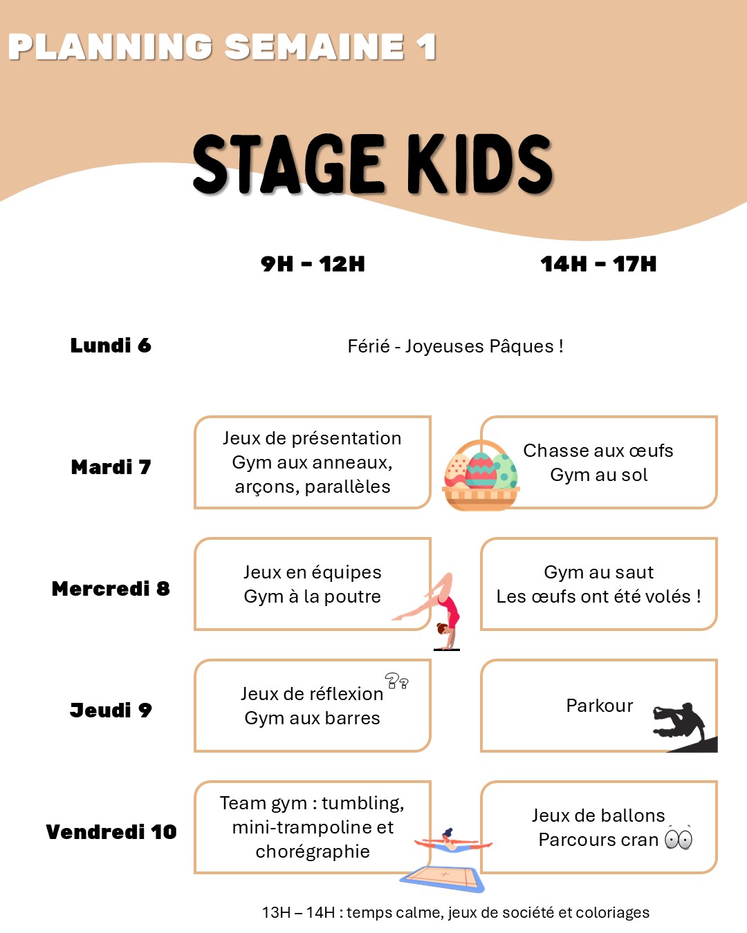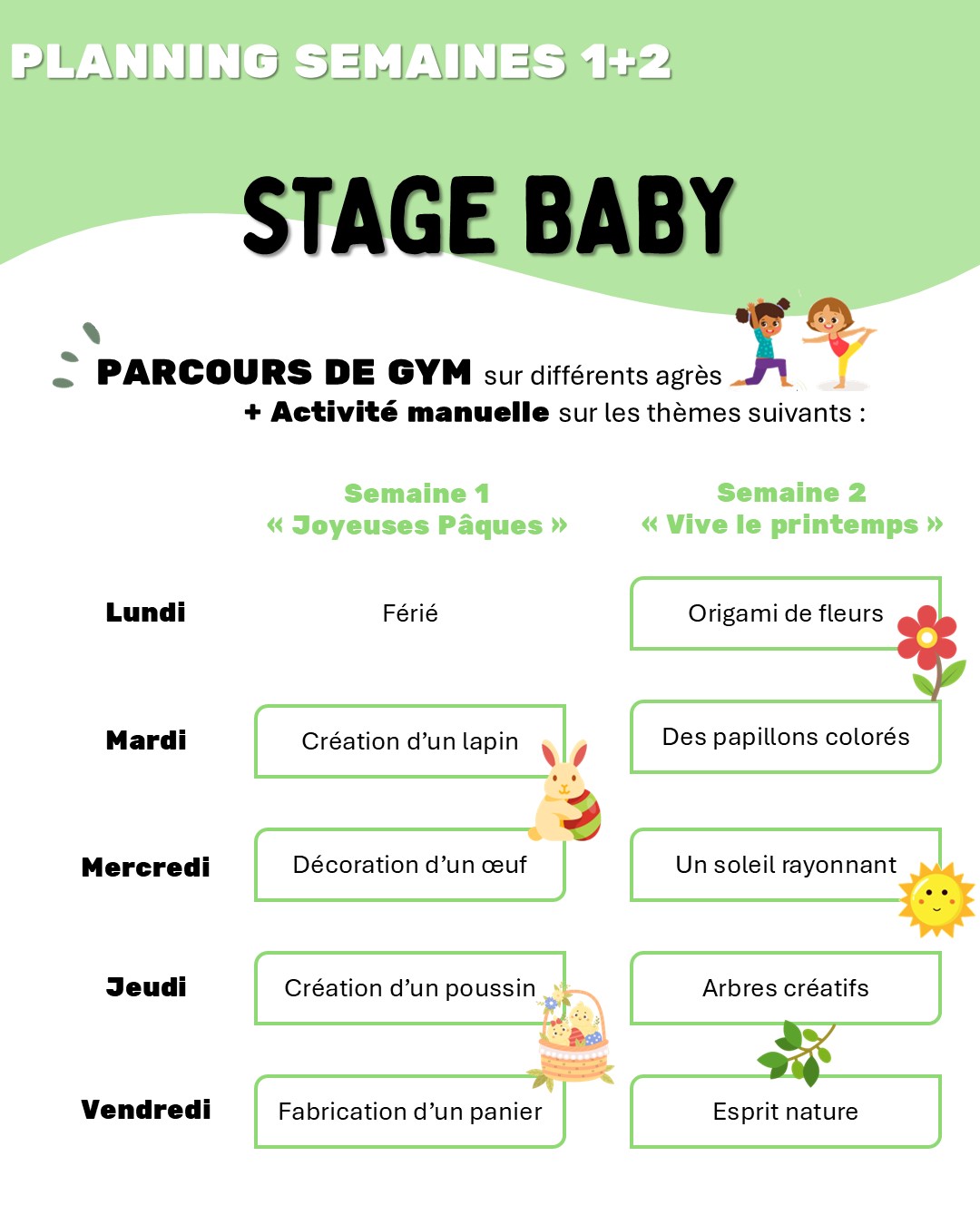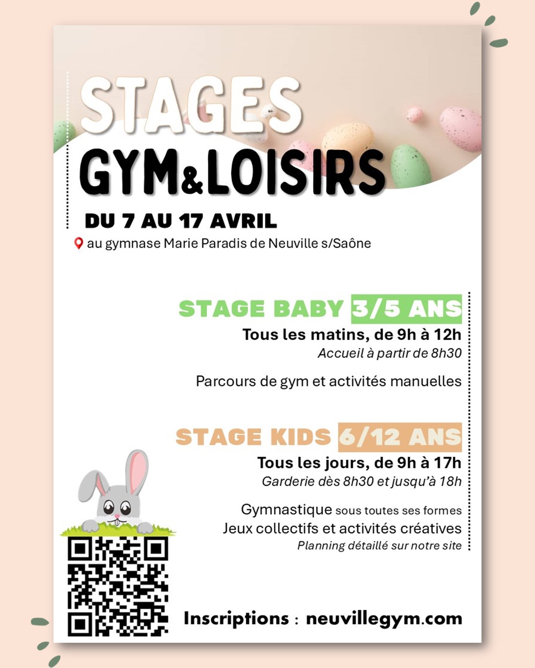 Neuville Gym organise deux stages gym & loisirs pendant les vacances scolaires de Pâques, du 7 au 17 avril :